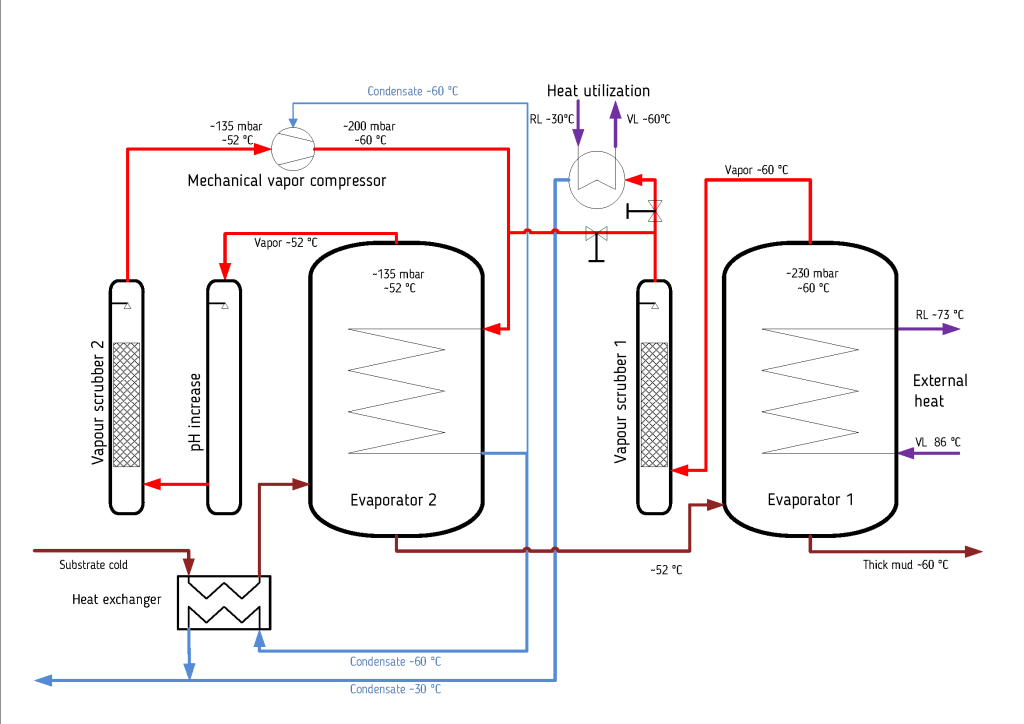 3. further vaporization process in the evaporator 2: As soon as vapor is produced in evaporator 2, the vapor from evaporator is routed to the mechanical vapor compressor (MBV). The compressed vapor is then used as heating steam for evaporator 2.