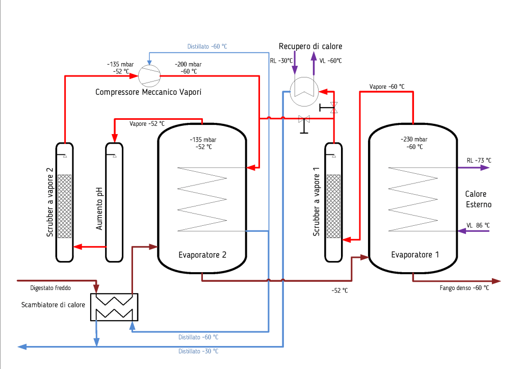 Non appena il vapore viene prodotto nell’evaporatore 2, le linee del vapore sono collegate in modo tale che il vapore dell’evaporatore 2 venga compresso tramite il compressore meccanico del vapore (MBV). Il vapore compresso, mischiato al vapore proveniente dall’evaporatore 1, viene quindi utilizzato come vapore di riscaldamento per l’evaporatore 2